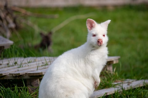 Auch unser Albino-Wallaby „Inala“ hat bei uns ein Zuhause gefunden. 2019 wurde sie als größter Stolz auf dem Känguruhof geboren. Ihr Name bedeutet in der Sprache der Aborigines „Frieden“. Für uns ist Inala etwas ganz Besonderes.