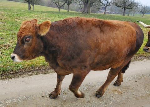 Britney vermittelt mit ihrem tiefen, ruhigen Muhen eine friedliche Atmosphäre. Sie ist scheu gegenüber Berührungen, daher braucht es Geduld und Feingefühl, um ihr Vertrauen zu gewinnen. Da sie ein bisschen übergewichtig ist, darf sie jedes Jahr auf die Alp gehen.