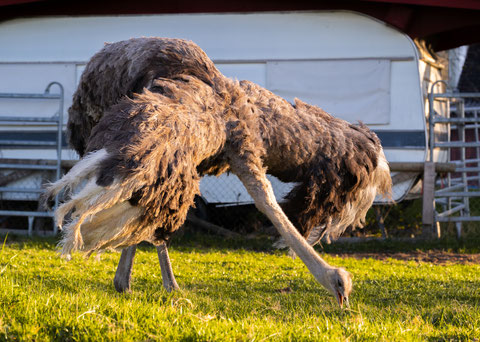 Hildegard ist unsere neugierige Straussendame mit großem Interesse an allem und jedem. Sie sucht gern den Kontakt und kommt mutig näher. Dabei pickt sie manchmal liebevoll – ein Zeichen ihrer